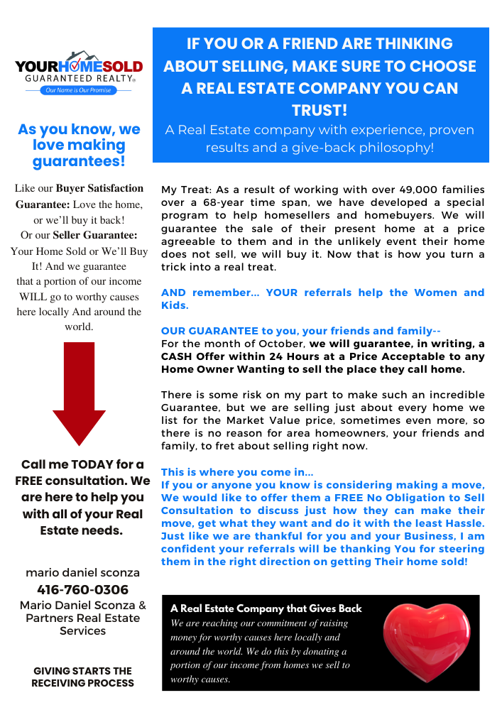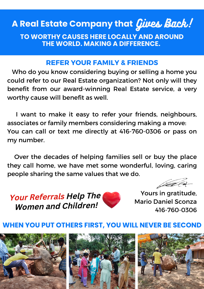 Over the last two decades of helping thousands of families sell their home and/or buy another, we have met some wonderful, loving, caring people. People like you! So your referrals, those you know considering a move, that we help – you can rest assured that not only will they get the award winning service we are known for and the guarantee to back it up, but that a solid portion of the income we receive from the transaction will go toward a very worthy cause.